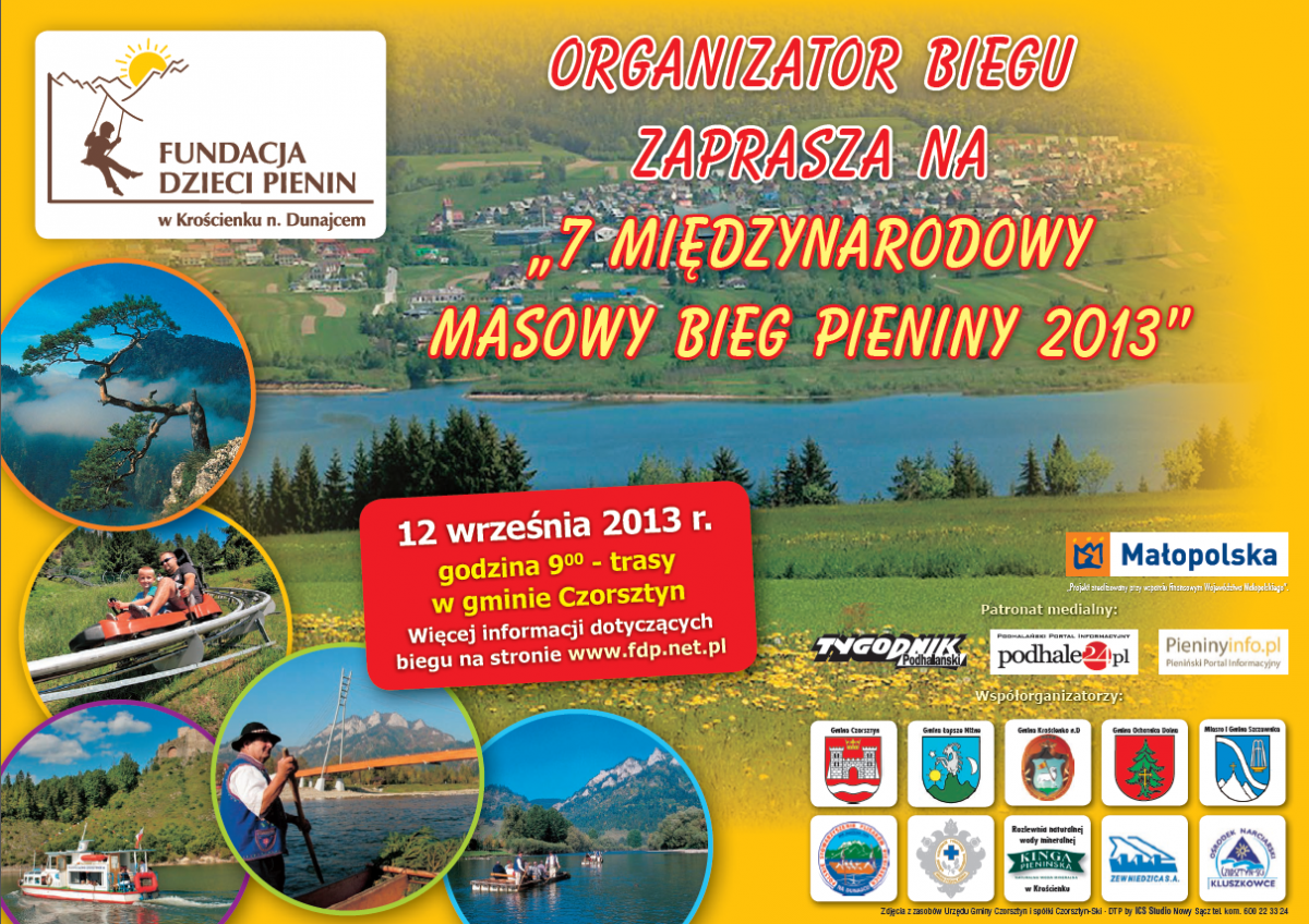 Fundacja Dzieci Pienin zaprasza na 7 Międzynarodowy Masowy Bieg - Pieniny 2013. W tym roku projekt ten realizowany jest przy wsparciu finansowym Województwa Małopolskiego, ze środków własnych oraz przekazanych przez współorganizatorów i sponsorów.