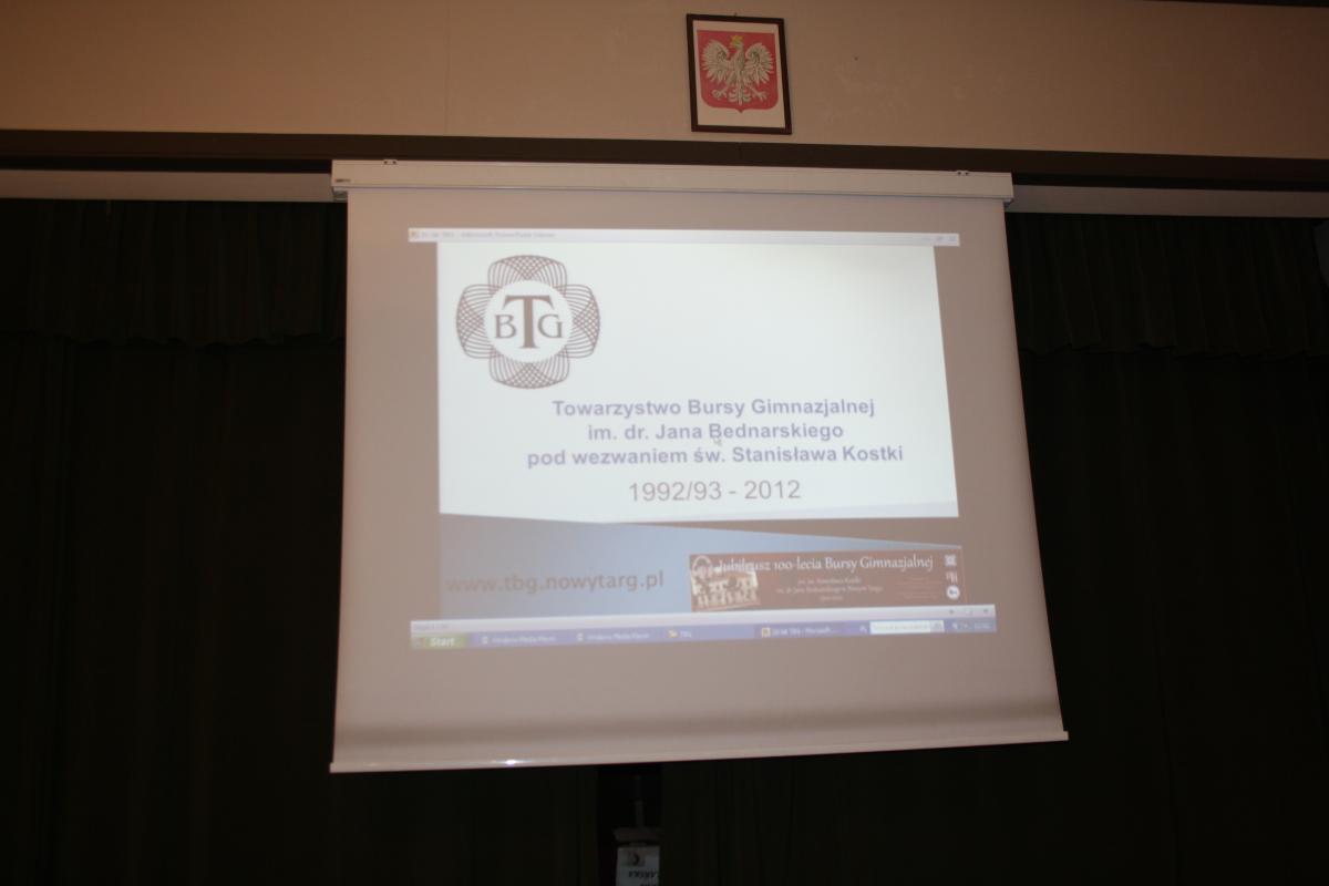 W dniach 11 oraz 12 października 2012 r. uczniowie I LO im. S. Goszczyńskiego w Nowym Targu uczestniczyli w obchodach jubileuszu 100–lecia Bursy Gimnazjalnej oraz 20-lecia wznowienia działalności Towarzystwa Bursy Gimnazjalnej. Czwartek był dniem, w którym odbywały się wykłady poświęcone roli Bursy Gimnazjalnej w procesie dydaktyczno-wychowawczym oraz funkcjonowaniu szkolnictwa średniego na ziemiach polskich w XIX i pierwszej połowie XX wieku (wyniki swoich badań zaprezentowali m.in. mgr Katarzyna Drożdż, dr Andrzej Niedojadło, mgr Arkadiusz Stanisław Więch).