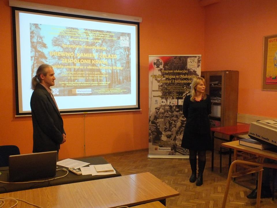 Natomiast w piątek 7 listopada w Bursie Gimnazjalnej odbył się interesujący wykład Szczepana Kowalskiego pt. „Drewno, kamień i żelazo zespolone krwią. Galicyjskie cmentarze z okresu Wielkiej Wojny”. W trakcie swojego wystąpienia prelegent zaprezentował unikatowe przeźrocza z lat 70 i 80-tych XX w. przedstawiające ówczesny stan zachowania zabytkowych cmentarz wojennych. Niezwykle cenną kolekcję slajdów przekazała p. Irena Szajnar, wieloletnia działaczką PTTK i przewodnik beskidzki. Spotkanie prowadziła p. Iwona Pawłowska, nauczycielka historii w II Liceum Ogólnokształcącym w Nowym Targu.
