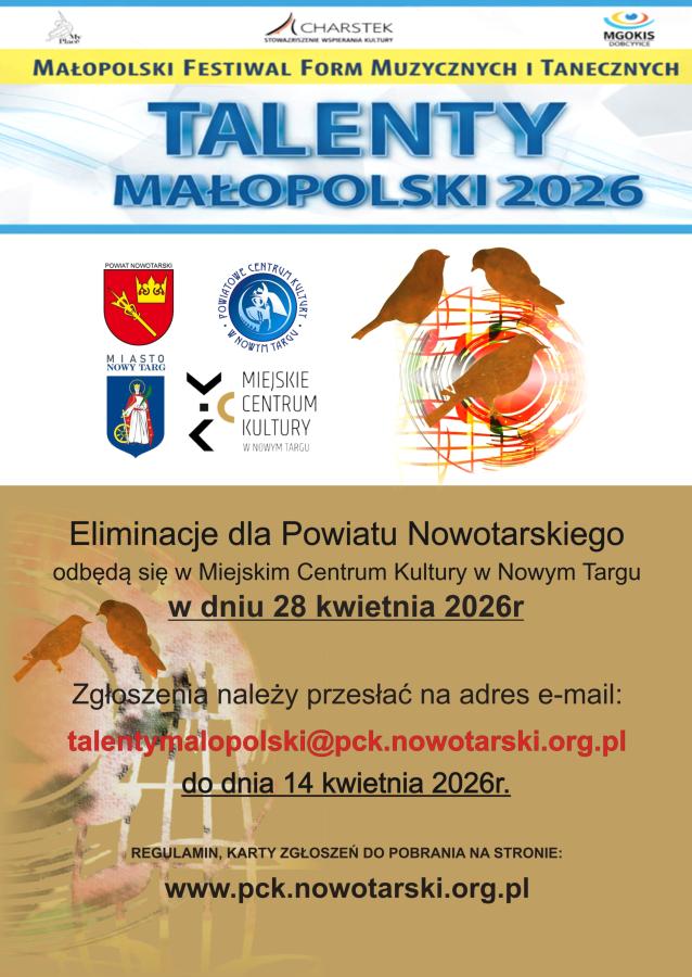 Rusza XXXV Małopolski Festiwal Form Muzycznych i Tanecznych "Talenty Małopolski". Jest to festiwal, którego celem jest propagowanie muzyki i tańca jako form artystycznego wyrazu dzieci i młodzieży, wspieranie rozwoju artystycznego młodych i uzdolnionych ludzi, wyłonienie w drodze konkursu „Talentów Małopolski” – najlepszych w dziedzinie muzyki i tańca solistów, duetów, zespołów dziecięcych i młodzieżowych oraz wymiana doświadczeń kulturalnych między uczestnikami, instruktorami, sędziami z różnych regionów Małopolski.