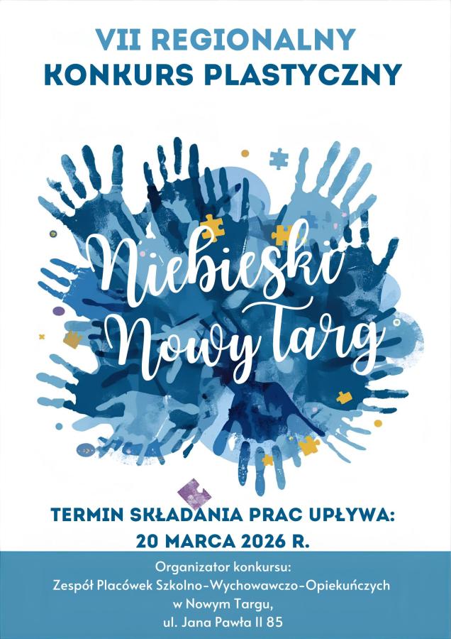 Zapraszamy do udziału w VII Regionalnym Konkursie Plastycznym „NIEBIESKI NOWY TARG” organizowanym przez Zespół Placówek Szkolno – Wychowawczo Opiekuńczych w Nowym Targu przy ul. Jana Pawła II 85.