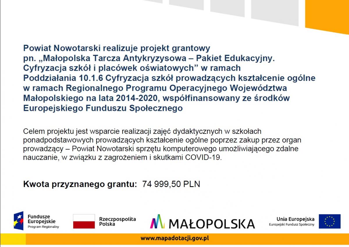 Powiat Nowotarski realizuje grant pn. „Zakup sprzętu komputerowego umożliwiającego zdalne nauczanie dla Szkół i Placówki Oświatowej Powiatu Nowotarskiego prowadzących kształcenie ogólne” w ramach Regionalnego Programu Operacyjnego Województwa Małopolskiego na lata 2014-2020, finansowanego ze środków Unii Europejskiej i Budżetu Państwa na podstawie Umowy o powierzenie grantu nr XXI/48/EK/21 z dnia 27 stycznia 2021 r.